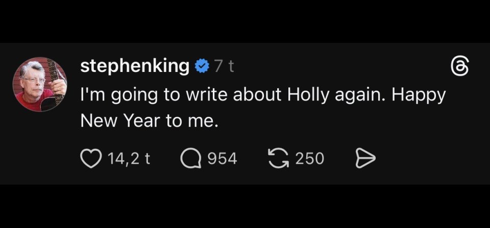 En su saludo de fin de año en las redes sociales, Stephen King anunció que volverá a escribir acerca de su personaje Holly, protagonista ya de varias novelas: «Voy a escribir sobre Holly otra vez. Feliz Año Nuevo para mí».